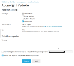 Sonraki sayfadan Yedekle butonuna basıyoruz. Yedekleme seçeneklerinden Veritabanları kısmını seçiyoruz. En sonunda Tamam butonuna basıyoruz.
