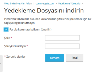 İndir seçeneğine tıkladıktan sonra aşağıdaki ekrandan parola belirlemelisiniz. Tamam butonuna bastı, yedeklerinizi indirebiliyorsunuz.